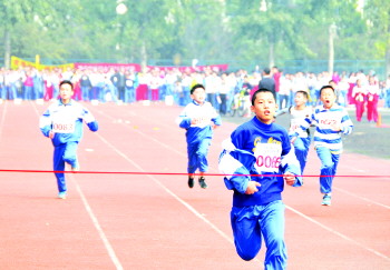10月29日,济宁学院附中2015年秋季运动会鸣枪开赛,开幕式上学生们表演了富有创意的军体拳、花球等表演。在为期两天的赛程中,有1248名运动员在13个比赛项目中展开角逐。颁奖仪式上,班主任为获奖运动员颁发别致的运动会奖牌。图为运动员在田径比赛中冲刺。
