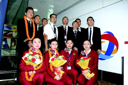 为了欢迎山航的到来,开飞当天,甘地国际机场用鲜花布置了值机柜台,多个电子屏幕打出欢迎标语,节日氛围浓重。在登机口,地面工作人员用印度传统的欢迎仪式向首航机组献上花环并点红(给客人前额正中点一个红点,这是印度给予尊贵来宾的一种传统礼遇),之后机组与机场工作人员共同切蛋糕,庆祝山航开飞印度航线。山航销售代表王帅也为第一位值机旅客赵先生赠送了首航纪念礼品。