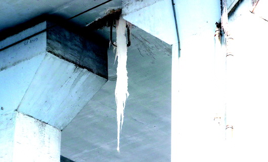 铁路桥内部桥顶上,分布着各类管道,在这些管道的连接处,经常有水从缝隙中溢漏。在平常日子,水只是沿着管道或者墙壁流下来,过往行人并没有太在意。济南近几日气温都在零度以下,这些水就凝结成冰溜子了,悬挂在桥下面,成为安全隐患。