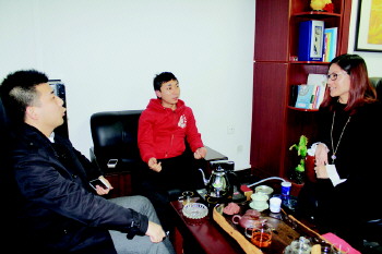 “蝴蝶”上线后,不少企业很感兴趣,来找王伟(右一)谈合作。 记者 吕璐 摄