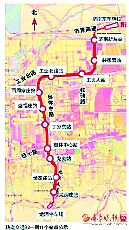 记者了解到,R3线一期工程11个站点的相关报告已编制完成,正开展初步设计工作。根据此前招标公告的公示,R3线一期工程起于龙洞庄站,沿龙鼎大道—奥体西路—工业北路—济南新东站中轴规划道路行走,止于济南新东站,设站11座,全线均为地下敷设。11个站点由南向北依次是龙洞庄站、孟家庄站、龙奥站、奥体中心西站、丁家东站、盛福庄站、西周家庄站、工业北路站、王舍人站、裴家营站和济南新东站站。