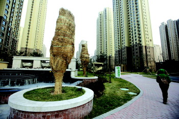 11日,新一股冷空气开始影响青岛,气温下降明显。全市最低气温-8℃左右,市区最低-4℃左右。冷空气来临前,市区不少树木已经穿上了草绳织成的“棉衣”保暖。图为一处小区里的香樟树、茶树被裹得严严实实。