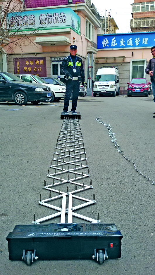 11日,天桥交警展示了新型的破胎器。其质量不超过3公斤,具备遥控功能。“3秒钟内破胎钉就能弹出,伸展开来可以占据两条车道。”天桥交警大队七中队中队长张峰说。