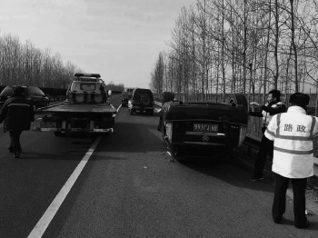 本报1月20日讯(记者 王琳)20日中午,一辆黑色轿车沿荣潍高速公路行驶到潍坊辖段时,由于操作不当,与前面一辆轻货车发生追尾事故。出于本能,追尾事故发生时轿车司机向右急打方向盘,导致车身失控,轿车向右侧倒翻后四轮朝天。