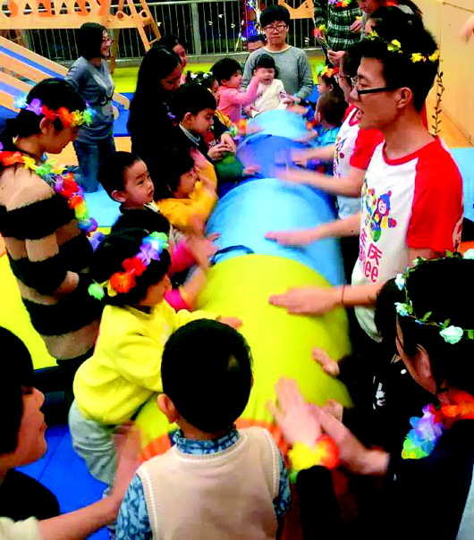 ◥金宝贝工作人员在和孩子们做游戏。