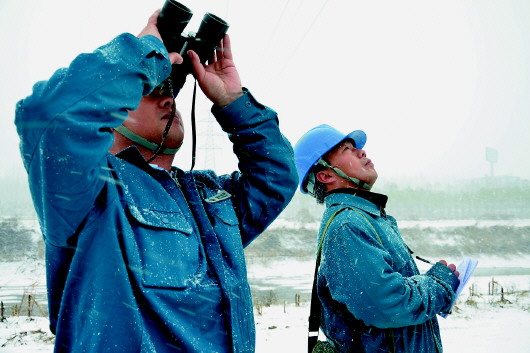 工作人员冒雪巡视确保线路安全。