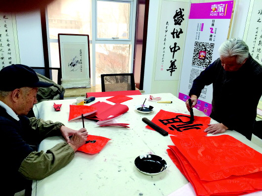 笔锋婉转处,浓墨飘香时。写春联、贴福字,是过年的传统习俗。“过了腊八就是年”,随着春节的来临,社区里年味也越来越浓了,家门口也该换新的春联和福字了。1月22日壹家社区服务中心历山路站特推出“壹家送福”活动,王立国老师和孙玉钊老师现场手写春联和福字,免费送给居民。 (本报记者 许建立 摄影报道)