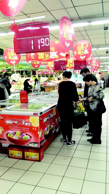 18日,记者走访市区多家超市看到,各口味的汤圆已经悉数上架,货量充足。在银座商城,多个汤圆销售冷柜占据了入口显眼位置,柜台上悬挂的“元宵喜乐惠”及红色的价格牌为超市增加了浓郁的节日色彩。