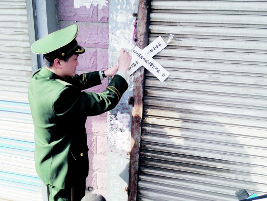 历城公安消防大队检查人员撕去门口的封条,环联小商品市场重新开业。 本报记者 尉伟 摄