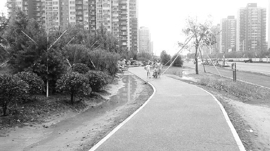 去年夏天大雨过后,实施了海绵化改造的凤凰路路边的小水塘还留有不少水。(资料片) 本报记者 王皇 摄