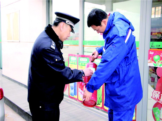 ◤民警指导加油站工作人员使用灭火器。