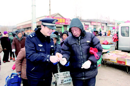 民警在集市上向群众发放《安全知识宣传卡》。