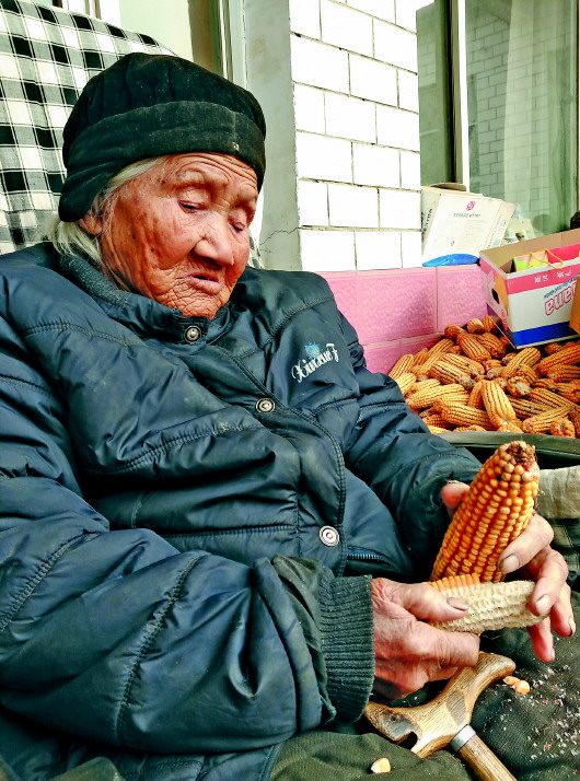 106岁的尹秀花剥起玉米粒相当灵活。 本报记者 梁越 摄