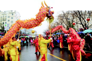 市民冒雨观看舞龙表演。