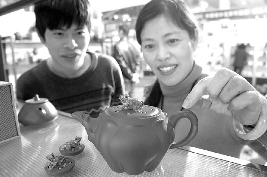 3月4日,祖籍山东的宜兴紫砂壶工艺美术师庄涵(右)在自己的展位前介绍一款“青蛙莲子”紫砂壶的制作工艺。 本报记者 陈文进 摄