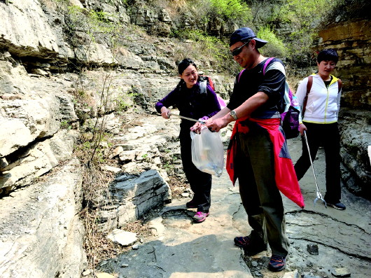 无痕志愿者在藏龙涧步道清扫垃圾。(受访者供图)