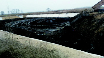 尚未靠近深坑,记者就能闻到阵阵刺鼻地恶臭。记者走近其中一个深坑时,看到深坑内已经倒满了黑色污泥,上面还有黑色的污水。在深坑的表面,都覆盖着一层塑料薄膜,起到了防渗的作用。但是,记者却发现这些薄膜多处出现了残缺破损的情况。