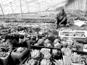 老农张士亮正在整理有待外销的盆景。