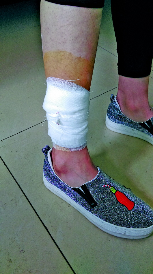 ◤小梁的脚踝上部被围挡刮掉一块肉。本报记者 李阳 摄