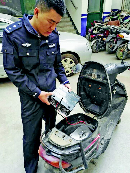 嫌犯将伪基站发射装置和电源藏在电动车座下的储物格内。