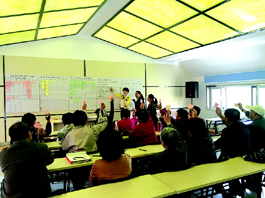 不一会儿,现场就热闹起来,刚入座的沉默僵局一下子被打破。紧接着,在社区工作人员的指引下,大家分别就“您对合唱团有什么期待?”、“您对合唱团的担心有哪些?”以及“自己能为合唱团做什么?”三个问题利用卡片法、归并法快速收集居民的心声,使用打分法、签名法对居民最担心的“团队组织纪律性”“课上知识吸收情况”“下课排练情况”等问题进行了深入讨论,并整理表决出公约。现场气氛平等友好,短短的一个半小时,所有的议题都有了结果。