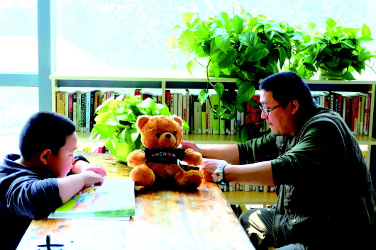 15日,在济南首家24小时书店睿丁岛书吧,一对父子正在悠闲地读书。 本报记者 范佳 摄