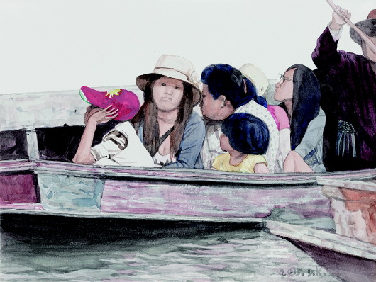 展出画作中的异域风情是泰国的水上市场,各种货物都在水上交易,买卖都在船上,这些画作杜大恺改用水彩。杜大恺称,他至少有30年没有画水彩画了,此次是他第一次展出水彩画作。
