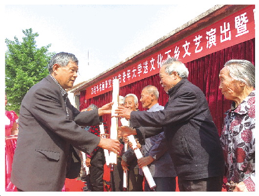 4月29日上午,山东省老年书画研究会副会长、莱芜市老年书画研究会会长何心振为莱城区寨里镇涝坡村97岁老人高立德赠送亲笔书写的“金石寿”字。莱芜市老年书画研究会副会长王克宝反哺家乡,为涝坡村65位80岁以上老人赠送亲笔书写的“寿”字,为了这65幅“寿”字,现年80岁的王克宝从书写到装裱用了近一个月的时间。同村的戴金炳也为村里14位90岁以上的老人赠送了亲笔画“富贵牡丹”。活动当天,莱芜市老年大学还为涝坡村民送去了由部分市级退休老领导参演的丰富多彩的文艺节目。