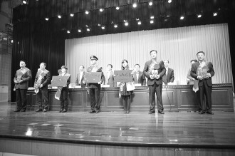 表彰大会现场,劳模代表上台领取奖章、证书和奖牌。 本报通讯员 李常胜 摄影报道