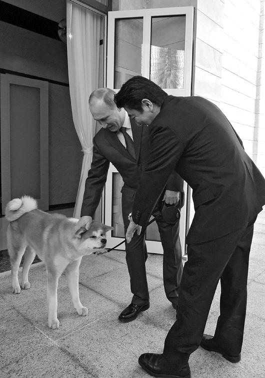 2014年2月,在俄罗斯索契,普京牵着一只秋田犬,在门口迎接来访的安倍晋三。(资料片)