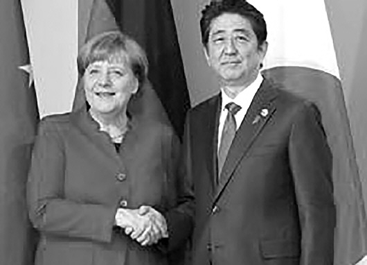 4日,德国总理默克尔与日本首相安倍晋三在柏林握手。 据共同社