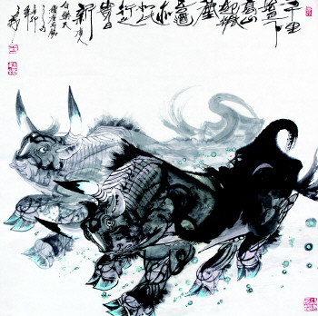不仅如此,山东花鸟画家们除吸收西方艺术精华,还强烈传达出对中国传统的执著与深刻认识,他们扎根传统,吃透精神,又努力突破局限,不断寻找新角度,呈现出或笔墨老辣、酣畅淋漓,或温厚雅致、清新灵秀的风格特色:王立志笔下的牛用线用色构图十分讲究,造像独特,有着极强的视觉冲击力与感染力;郭志光的大写意花鸟注重绘画构图与笔墨的结合,刚柔兼济、博大雄厚,深化了笔墨韵味和写意精神;李方玉的竹子蕴含北方艺术家敦厚、朴实与雄壮的特质,又有南方文人清润、俊逸之格调;而沈光伟在花卉、草木、蔬果题材的表现中,饱含当代文人