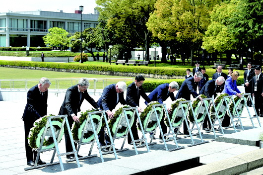 ◥4月11日,出席七国集团(G7)外长会的七国外长在日本广岛和平纪念公园向原子弹爆炸死难者慰灵碑献花。 新华社发