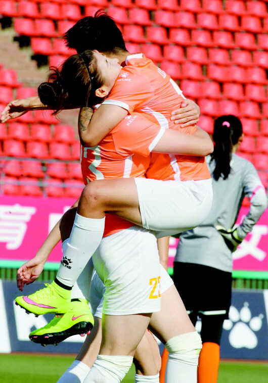 赵雪下半场一记漂亮的进球帮助山东女足逆转取胜。 本报记者 王鸿光 摄