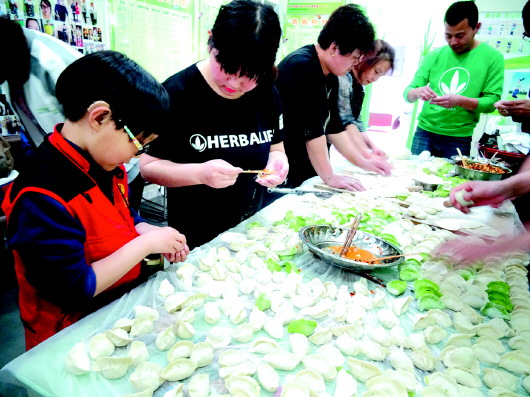 小宁正在学习包水饺。本报记者 左庆 摄