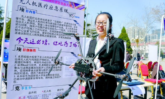大学生创业热情很高,近日,山东师范大学举行大学生创业大赛,一在校生展示自己小组独创的无人机医疗应急系统。