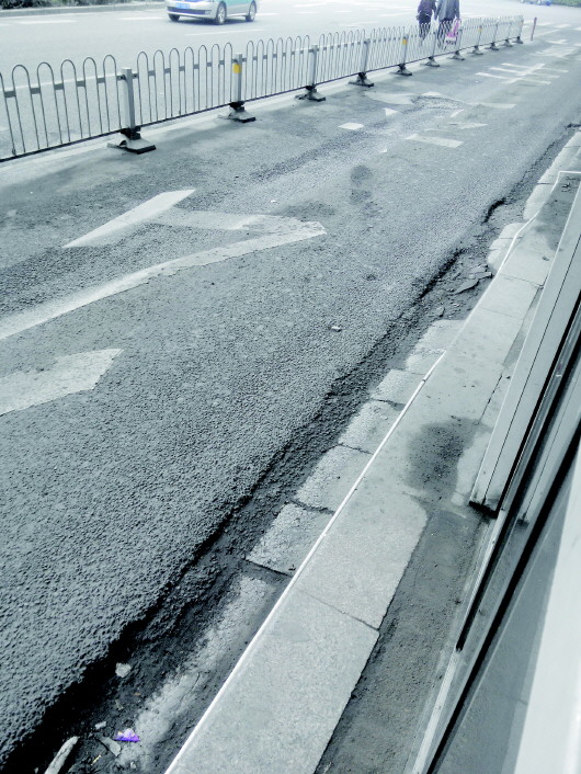 全福立交桥西站台BRT专用车道的车辙。 本报记者 王皇 摄
