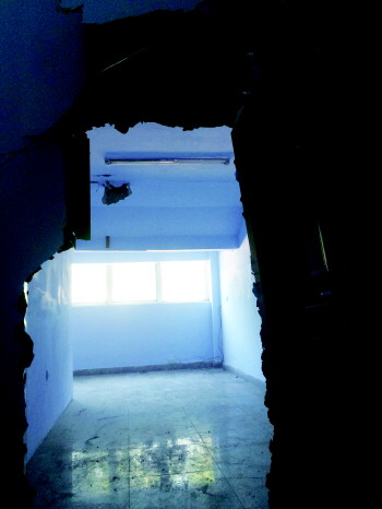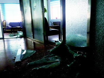 记者在家具广场1楼西南角楼道口处看到,原本在楼道空旷处搭建的一间办公室已经完全解体,破碎的板材堆积在一起,已经很难看出办公室的影子。1楼北侧的一间10平方米左右的办公室也已经被砸。24日早上,大地物业一管理人员发现办公室被砸后,气愤不已,手持扳手冲到新物业公司,将比邻物业公司办公室砸了一通。“所有的玻璃幕墙和5台电脑都被砸了。”比邻物业公司工作人员称。