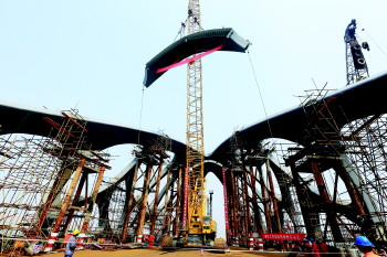董志强介绍,该桥的点睛之笔就在钢结构装饰拱上,全桥多肢钢结构拱共分为160个节段,每个节段皆为不同的三维空间异形曲面结构,制作安装难度大,精度要求高,对景观效果的实现至关重要。其中拱肋和拱肢的三维异形圆弧导角采用8毫米外包钢板现场安装焊接,加工精度由规范要求提高到了1毫米以内,有效地保证了钢结构装饰拱的外观效果。