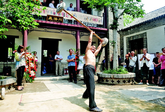 1日,石担石锁第三代传人李存禄在百花洲为游人表演。当日,百花洲实验性开放,传统老字号和许多非遗项目唱起主角,古法造纸、形意拳等非遗展演让游客有了穿越的感觉,也让老济南找到了儿时的印记。