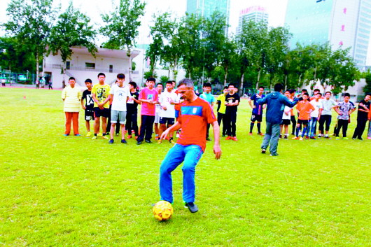 6月4日下午,青少年足球公益训练营开营仪式在济南七中举行,济南七中塞尔维亚籍足球外教博丹,泉城中学荷兰籍足球外教卡其斯那均到场,指导营员专业技术训练。据悉,上述两名外教为济南市目前仅有的校园足球外教。博丹还是山东省中小学校中第一个外籍足球教练,去年12月份到岗。卡其斯那今年3月份开始在泉城中学任教。