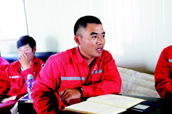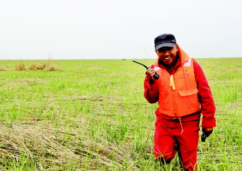 2007年,我从退伍军人的身份转变为一名地震勘探工。2009年,我成了钻机班长。天天爬烂泥,信号不稳定,进入海区以后常常打不通电话,这是我们的工作环境。现在这个项目是从3月1日开始的,3月29日打下第一口井,工期紧,大家日夜赶工,没有时间回家。环境差,工作苦,但是队里氛围好,我喜欢这个工作,也感谢家人对我的支持。