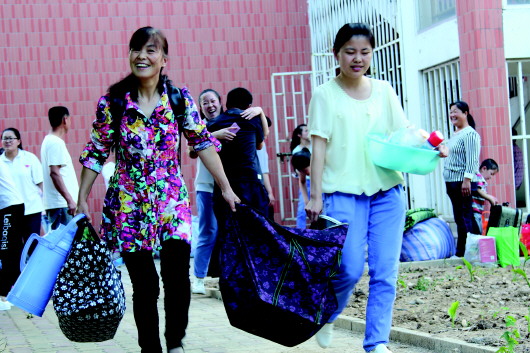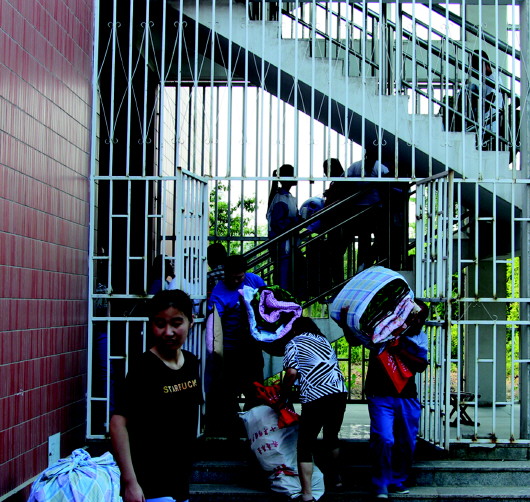 女生宿舍楼门口,正在往外运行李的家长和学生络绎不绝。 本报记者 郗运红 摄