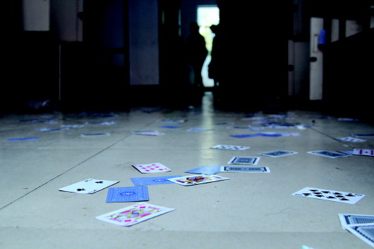 男生宿舍楼一间人去楼空的宿舍地面上洒满了扑克牌。 本报记者 郗运红 摄