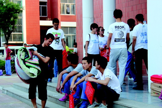 准备抱行李离开的学生还在恋恋不舍地和同学道别。 本报记者 郗运红 摄