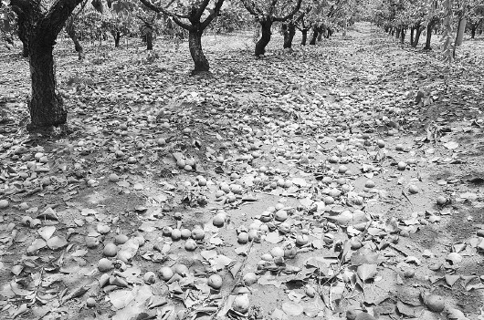 14日晚,昌乐一处果园,冰雹将大量的桃和杏打落在地。本报记者 孙国祥 摄
