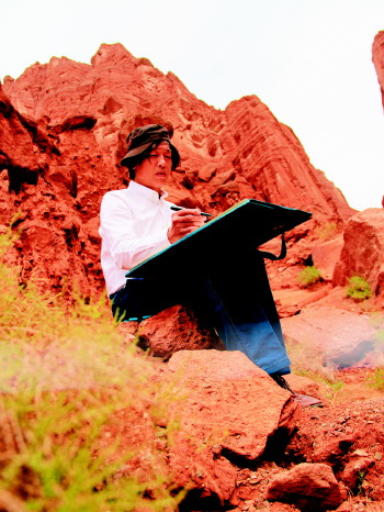 自20世纪90年代初,开始对新疆广袤的瀚海戈壁、自然山川、风物人情、天山大漠、丝绸古道进行了深入探索研究。历经二十几年二十几次走进新疆,在文化是传承、艺术是创造中创立了“天山山水画”的独特风格,开拓了中国山水画创作的新领域。追求悲壮之美、苍凉之美、雄强之美、阳刚之美。以大漠为纸、胡杨为笔,以炽热的红色激情,泼洒生命的旋律,谱写天的大象、山的风骨,奏响道法自然、天人合一的乐章。