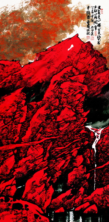 “天山红”系列作品的创作开始于2000年。“天山红”的美好名称来自于南疆大地上那几十平方公里的的红色沙岩,古人称之为赤砂山,当地人称为克孜利亚,意为“红色的山崖”,也就是今天的“天山红色大峡谷”。每当晚霞撒向山谷这里总是红得似火,撼人心动。新疆人不但称这里为神山、圣山,更是用红山公园、红山广场等名称和地标构成了红色为主题的人文景观。从2000年起,“天山红”的画作也开始随着这里的云雾自然升腾。 (贾佳)