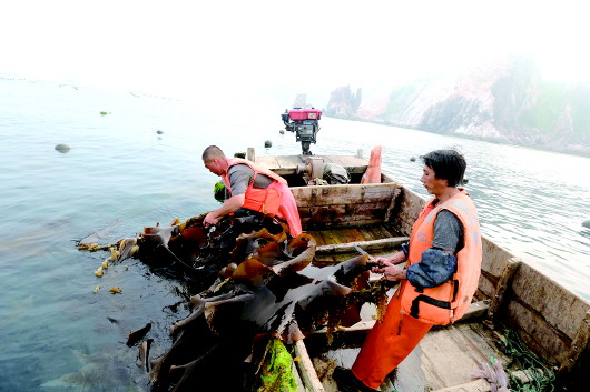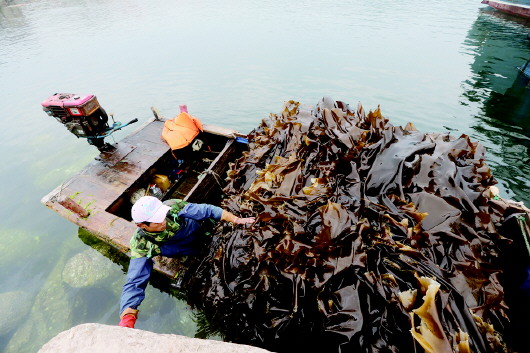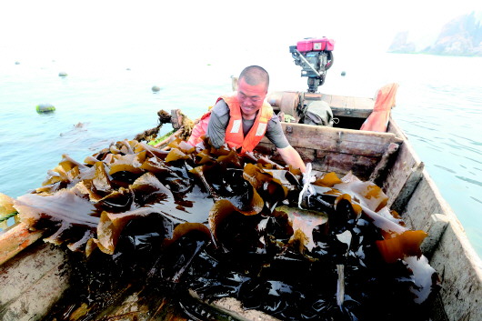 收割船满载海带,运往海边晾晒。