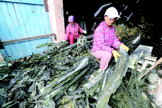 海带加工厂内,工人对海带进行修边处理。